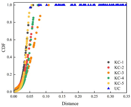 The probability distribution visualization is similar to the KCs distribution in Figure 4 of Section 3.4, where KC-1–KC-5 represent the distribution of KC training samples, and the blue triangle represents the distribution of unknown samples in the test phase. It can be found that the distribution of the known samples is a monotonically increasing function, with an increasing distance indicating a larger the CDF value.