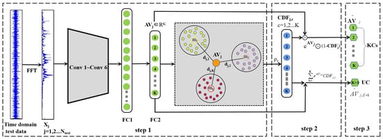 - Input test data into the trained model, and the AV extracted from the test sample is denoted as . The represents the distance between the test sample and the of the KC to estimate whether the input is "far" from the known training data. The can be expressed as: