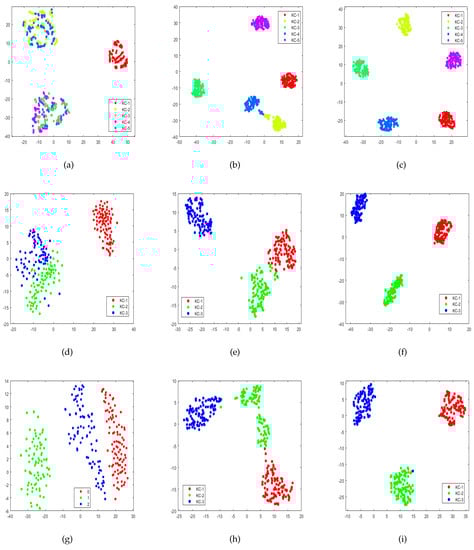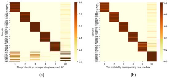As shown in Figure 7a,b, this paper visualizes the probability value distribution of the revised AV before and after improvement. As shown in Figure 7a, it is easy to misclassify unknown samples into KCs. As shown in Figure 7b, it can clearly be seen that KCs and UC completed the correct distribution of KCs and UC, which verifies the effectiveness of the method used in this paper.
