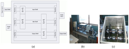 The gearbox used in PHM 2009 Challenge Data: (a) gearbox schematic; (b) gearbox apparatus; and (c) gearbox inside [45].