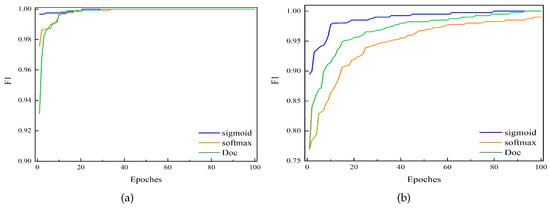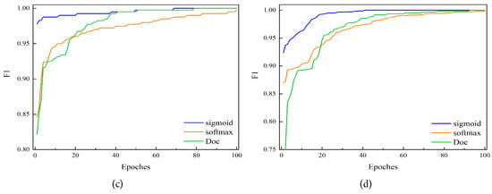 To further verify the performance of the proposed method, we also implemented the code of the DOC method [16] in the literature. Figure 16 shows that the comprehensive results of three different methods are compared on four datasets. The first method (shown in blue) used multiple sigmoid functions to replace a single SoftMax function at the last layer of the model and then applied it to the improved OpenMax method, i.e., the method proposed in this paper. The second method (shown in orange) used SoftMax function as the output layer of the last layer of the model. The third method (shown in green) used DOC, and to ensure the consistency of the experiment, CNN in the DOC method is modified to the model proposed in this paper. It can be seen from Figure 16 that our proposed method not only has better accuracy but also has better convergence than the other two methods in the comprehensive result F1. This shows that the proposed method noticeably outperforms those of the other two methods, which further verifies the superiority of our proposed method for OSA-based bearing fault diagnosis. The code is implemented in https://github.com/zccguess/OS-CNN.