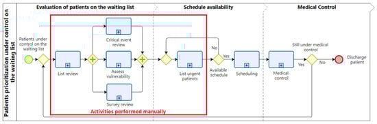 The second element of the prioritization function corresponds to a factor that dynamically evaluates the occurrence or absence of each critical event for the managed patients waiting for care. Let be the dichotomous factor that evaluates the daily presence of critical events in patients, i.e., . For example, if on day of the month, a patient p suffered a critical event, e.g., consulted for a health problem in the emergency unit, Urg, the system automatically assigns 1 and maintained this condition for 30 more days, . In contrast, if on day , a patient did not suffer from critical events, the system automatically assigned 0, i.e., . However, if the same patient on day suffered from a critical event, e.g., the patient’s medication prescription expired, Pre, the system would automatically assign 1 and maintain this condition for 30 more days, i.e., .
