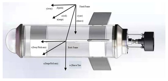 where M and are the inertia, additional quality matrix, and Coriolis centripetal force, respectively. and are the fluid damping and operation and the restoring force of the gravity according to the buoyancy. are a series of moments and forces; are the accelerations in the body frame; are velocity in roll, pitch, and yaw direction, respectively, in the moving frame; are surge position, sway position and heave position, and roll angle, pitch angle, and yaw angle in the fixed frame, respectively. In the moving frame, the accelerations of the AUV model can be decomposed into two different parts, linear velocity and angular velocity . In the fixed-frame, the velocity of the AUV model can be decomposed into position and orientation . In this paper, we research the AUV’s linear velocity and linear position .