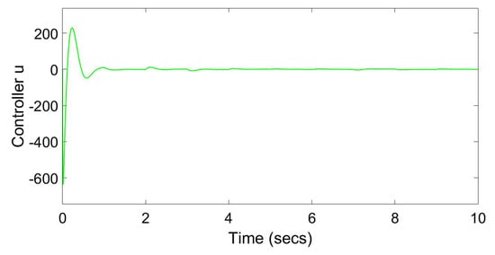 By comparing Figure 3, Figure 4 and Figure 5 and Figure 6, Figure 7 and Figure 8, we can see that in the absence of the Bernoulli probability controller, the system’s state will be affected by external interference, and there will still be fluctuations in the state under the action of the controller. After the addition of the Bernoulli probability controller, the simulation results from Figure 3, Figure 4 and Figure 5 strongly prove that the probability gain controller can achieve the effect of eliminating external interference, and the time and efficiency of the controller are not affected under the action of the probability controller. Finally, by comparing with the PID control effect Figure 9 and Figure 10, we can reduce the control time from 10 s to 2 s. However, due to the enhanced control effect, the peak consumption of this controller increases from 4 to 200, and the increase of the controller consumption is within our tolerance range. Nevertheless, the controller’s action time was reduced from 15 s to less than 1 s.