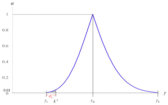 where and are determined by and , respectively. Let set be the area in the graph of and set be the area in the graph of but to the right of the vertical line . Figure 2 demonstrates the membership function with vertical line .