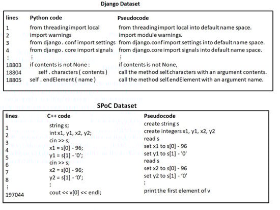Django [] and SPoC [] datasets were used to evaluate the proposed model. The Django dataset has Python source code, while the SPoC dataset has C++ source code. Datasets samples are shown in Figure 4.