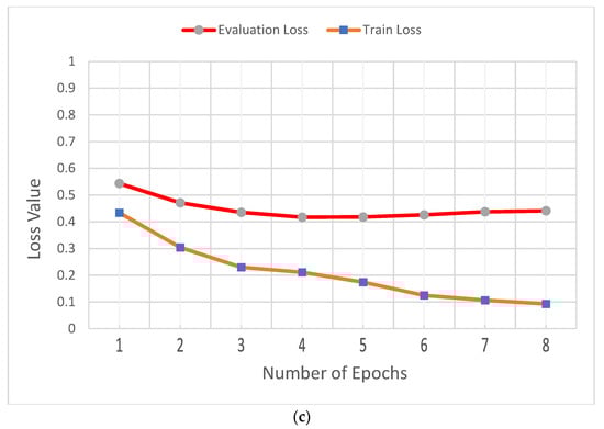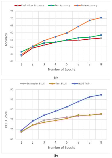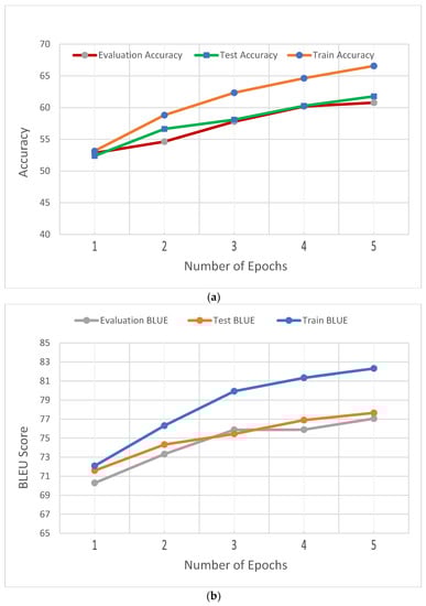 The BLEU [] metric was used for measuring the proposed model’s accuracy. This metric measures the matching between the models’ outputs and the actual outputs. The value of the BLEU metric ranges from zero to one. The highest value (i.e., one) indicates that we have a complete match between the models’ outputs and the actual outputs. Different forms of BLEU were utilized based on different grams.
