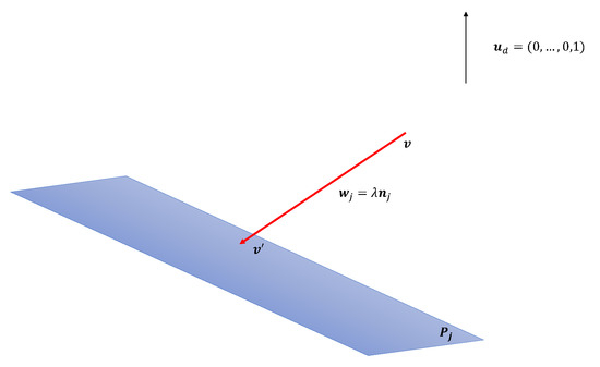 The normal vector of the hyperplane is [43]. To verify whether is an upper or a lower hull, a vector , which starts at a point of the convex hull (but not on ) and ends at a point in , is used to determine the orientation of . Pick an arbitrary vertex and project it on the hyperplane to obtain the projected point . Thus, satisfies two equations: