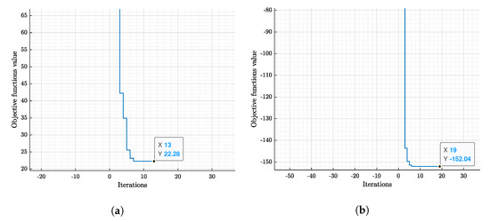 Two examples of the progress of the BFGS algorithm in solving convex problems in high dimensions are illustrated in Figure 9a (for ) and Figure 9b (for ).