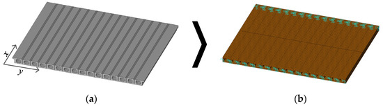 The model of a hollow slab bridge: (a) finite element model; (b) equivalent orthotropic plate model.