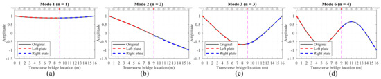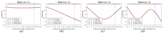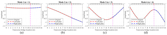 When the hinge joint is equivalent to the elastic support boundary, Figure 8, Figure 9, Figure 10, Figure 11 and Figure 12 show the comparison between the first four transverse modal shapes of “plate L” and “plate R” and the first four transverse modal shapes of the original orthotropic plate structure. Figure 8 shows the modal shapes of “plate L” and “plate R” when the hinge joint at the center of the cross–section is equivalent to the elastic support boundary. It can be seen that the equivalent modal shapes are in good agreement with the original modal shapes. At this time, because the two plates are symmetrical, it is a special case, and it is necessary to verify the equivalence of the hinge joints at other positions.