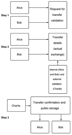 At first, Alice and Bob must signal their intention of a quantum exchange to the community (which can be interpreted as a public request to the system); then, randomly selected entities should be informed of an active transfer taking place on a certain shared communication infrastructure and tasked with overseeing the legitimacy of the transaction (therefore, special attention should be given to the state of certain qubits). For simplicity, we discuss the case of only a single validator, Charlie.