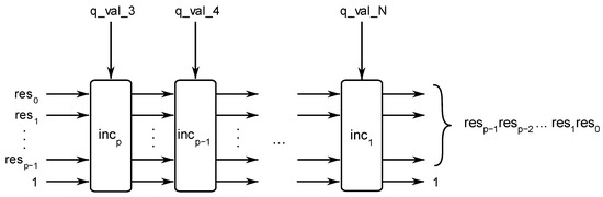 This is illustrated in Figure 4, where each qubit , with , is initially set to (the circuit is adapted from the one proposed in [32]); we are activating the increment option with each of the qubits (if the validator agreed on the transfer).