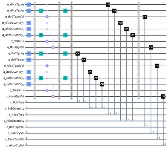 In this configuration, all qubits are at first in the state. Then, we set the qubits indicating Alice’s and Bob’s type of goods and quantity in the superposition (a Hadamard gate is applied on each of them). Then, on each group of qubits we act with a potential set of NOT gates; the idea is that we want to obtain the desired (corresponding) values for the particular transfer. Another layer of NOT gates that mirrors the first one is applied at the end. We configure the qubits’ state for the scenario of Alice transferring three goods of type-1 to Bob, who sends five goods of type-2; the NOT gates in the initial layer are added for the qubits that correspond to bits of 0 in the binary representation of each particular value.