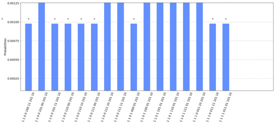 The results obtained after simulating the circuit illustrated in Figure 5 are shown in the probability histogram from Figure 6, which contains the zoomed-in version of the results; the full version contains entries (there are 10 qubits in superposition), and thus, it is difficult to visualize all the results. The theoretical probability is , and is also what we obtained in our experiment.