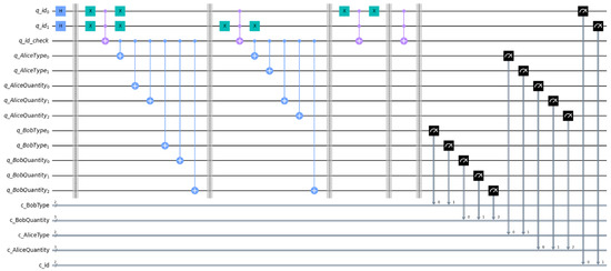 For this circuit, we notice the fact that Alice’s and Bob’s type and quantity qubits are no longer set in superposition; the two identifier qubits ( and ) are the only ones on which we apply Hadamard gates, in a similar way that we apply Hadamard gates on the position qubits in the NEQR representation. A single ancilla qubit, , is set to the state using a CCNOT gate when the id qubits are in the state (thus, NOT gates are applied on them for the state). This qubit sets the corresponding state for Alice’s and Bob’s qubits for each particular transaction. Each section between the barriers represents a transaction, and by measuring, we know the transfer id in relation to the actual configuration of the exchanged goods. The exchange circuit from Figure 7 contains two transactions: