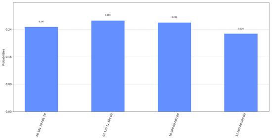 The measurement results are shown in the probability histogram from Figure 8. We notice the expected results, each with a probability of 25%. After simulating the circuit, a third entity (validator) can easily see the transferred goods for each transaction. The issue for this scenario is finding a secure way to configure the links between the qubit and the other qubits. Unlike the first proposed method, where the parties can set the states for their qubits and have a validation qubit for each of the other party’s data, here there would have to be a way for Alice and Bob to link their qubits to the qubit; a solution for this problem should be searched at a physical level of the quantum infrastructure and is beyond the scope of this article.