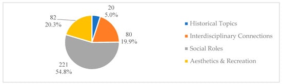 According to the conceptual framework of mathematical culture, the test items with mathematical culture according to four categories were counted, and a pie chart was obtained (see Figure 2). Combined with the statistical data, there was an extremely uneven content distribution of mathematics culture in the mathematics tests of the Gaokao, and more than half of the content of mathematics culture focused on the category of Social Roles, with 221 items in aggregate, accounting for 54.8% of the total items, followed by Interdisciplinary Connections and Aesthetics & Recreation, both accounting for about 20%. The category of Historical Topics was less frequent, only accounting for 5.0%. From the overall data, it seems that the mathematical culture in the Gaokao items focused more on the application of mathematics in real life and less on the process of mathematical knowledge generation and development.