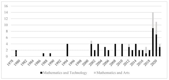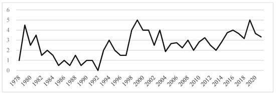 Considering that the number of national papers varied from year to year, the average quantity of test items with mathematical culture for each year was calculated (the number of test items divided by the number of the test papers) (see Appendix B, Figure 3). First, it can be seen that the number of items with mathematical culture was generally low. Specifically, the annual mean of the number of items with mathematical culture was 2.51 in the national papers of mathematics tests of the Gaokao in the past 44 years, with a median of 2.50. The mean of the number of items was three or less in more than half of the years (65.9%), with only two years (1999 and 2019) having five and the year of 1992 having zero. Second, the number of items with mathematical culture was volatile, with a significant increase in recent years. Figure 3 shows that the number of test items with mathematical culture has been more volatile over the past 44 years, having peaked in 1979, 1999, and 2019 for a short period.