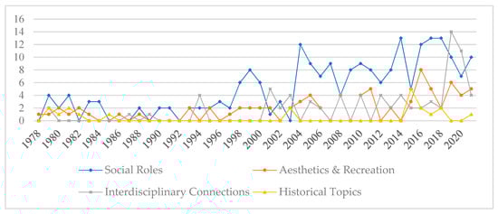 Combined with a line graph of the changes in the number of test items with mathematical culture in different categories (Figure 4), it can be inferred from the vertical axis that the changes in the number of test items in the categories of Social Roles, Interdisciplinary Connections, Aesthetics & Recreation, and Historical Topics showed fluctuation, although the test items of each category had their own characteristics in history. It can also be inferred from the horizontal axis that the content distribution of mathematical culture in test items of different years was also similar to the overall content distribution of mathematical culture in test items. In almost all years, the number of items in the category of Social Roles was the highest, followed by the categories of Interdisciplinary Connections and Aesthetics & Recreation.