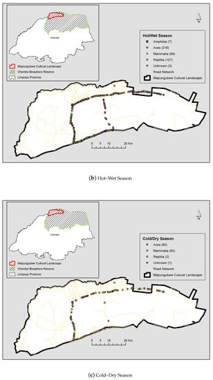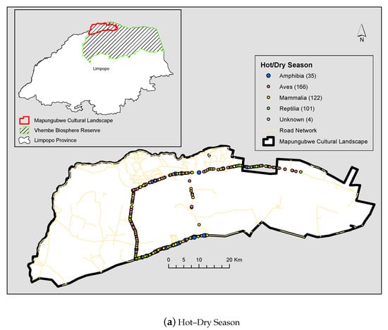 The data showed that different taxa were killed in the three different ecological seasons (Figure 1); during the hot–dry season, amphibians (35), mammals (122), reptiles (101), birds (166), and four unknown wildlife species were killed. In the hot–wet season, amphibians (7), mammals (96), reptiles (127), birds (216), and three unknown species died from vehicle collisions. Finally, we observed a similar death rate in the cold–dry season for mammals (82), reptiles (2), birds (65), and one unknown species. Other similar datasets and research related to [] in South Africa are [,].