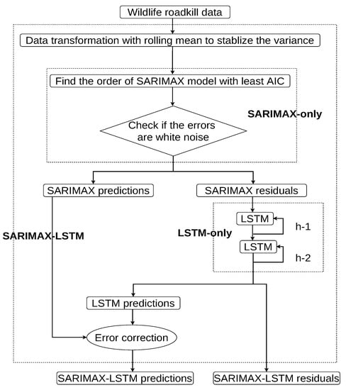 The transformed data were first passed into the SARIMAX-only model; the LSTM-only used the prediction errors from the SARIMAX-only to correct or calibrate the predicted output of the SARIMAX-only. In other words, the SARIMAX-only output the roadkill prediction with some error residuals; these error residuals were the inputs of the LSTM-only. The latter predicted the error residual, which was used further to correct the prediction of the SARIMAX-only. The flowchart in Figure 2 shows the sequential order in which the dataset traveled through the different machine learning models to generate the error correction model. The raw patterns of the wildlife roadkill data were transformed, as discussed in Section 5.1.