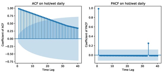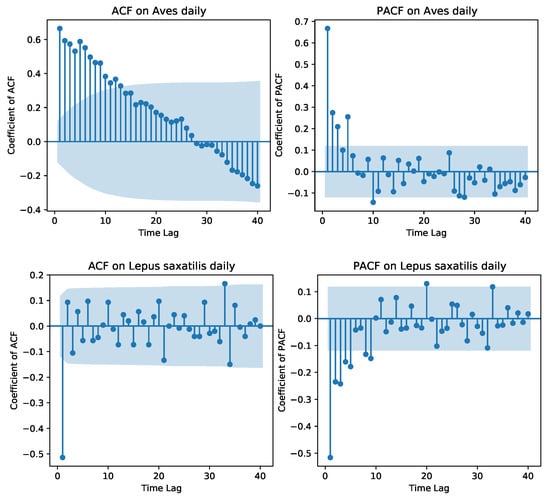In this work, we visualized the ACF and PACF for lag 40 on both the original and the transformed dependent variables of daily wildlife roadkill, as well as the exogenous variables, as shown in Figure 3, Figure 4, Figure 5 and Figure 6. To obtain the p values and seasonal P values for the AR and seasonal AR for the SARIMAX model, we referred to the PACF plots and looked at the ACF plot to obtain the q value and seasonal Q.