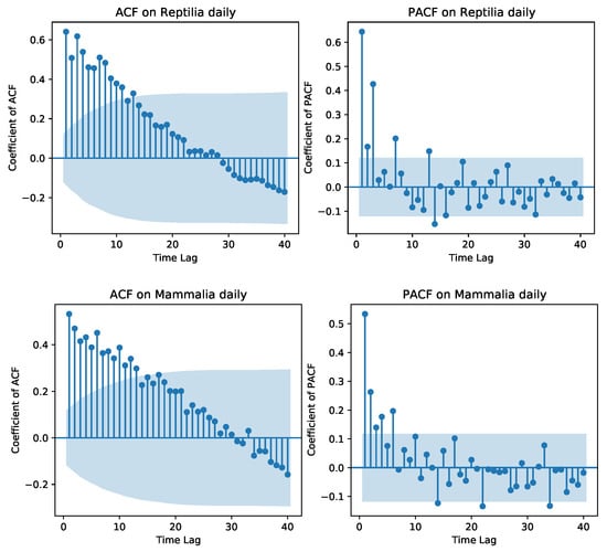 The ADF test statistic values should always be smaller than the critical values at either or all 10% (0.1), 5%, (0.05), or 1% (0.01) in a stationary dataset. For this work, we chose a critical value(s) at 10% (0.1) and 5% (0.05) for the six taxa represented. As such, the more negative the ADF statistic value, the more likely the data were stationary. In Table 3, it can be seen that the ADF statistic value of the transformed Mammalia data, which was −2.84, was less than the critical value of −2.57 at 10%; the transformed Aves dataset’s ADF statistic value of −2.58 was also less than −2.57 at 10%; the ADF statistic value of the Reptilia transformed dataset was −2.98, which was less than the critical values of −2.87 at 5% and −2.57 at 10%; and for the transformed Lepus saxatilis, the ADF statistic value was −9.83, which was much lower than the critical values at 10%, 5%, and 1%. In addition, it showed an extremely lower -value. The original datasets for Caprimulgus and Numida meleagris were stationary with ADF statistic values of −3.00 and −2.92, respectively. Their ADF statistic values were less than their critical values at both 5% and 10%. The results from the stationary test showed that all data from the different taxa were stationary. The -values were equal to 0.05, 0.09, 0.03, , 0.03, and 0.04 for Mammalia, Aves, Reptilia, Lepus saxatilis, Caprimulgus, and Numida meleagris, respectively, which were less than the 10% and 5% thresholds.