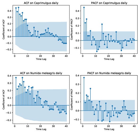ACF (top-left panel) and PACF (top-right panel) on the Caprimulgus data showing stationarity. ACF (bottom-left panel) and PACF (bottom-right panel) on the Numida meleagris data showing stationarity on endogenous variables.