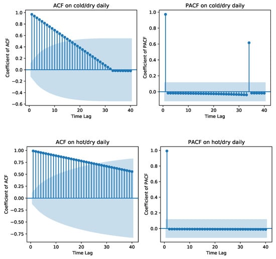 With regard to Table 4, the stated standard guidelines helped us determine the kind of ARIMA linear models that best suited a specific dataset. The SARIMAX-only contained the non-seasonal and seasonal parameters, where are the seasonal lags and S is the seasonal period. In addition, this model was determined with the help of the ACF and PACF. The ACF tailed off smoothly for the model, and the PACF cut off at lag p for the seasonal model. For the model, the ACF cut off at lag q or seasonal lag Q, and the PACF tailed off smoothly. A model was determined when the ACF and PACF tailed off smoothly. The non-seasonal parameters were p, the AR component in ARIMA-only; d, the same as the I component in ARIMA, which denoted the number of times the successive differencing operation was performed to make the series stationary; and q, which was the same as the MA component in ARIMA. The seasonal parameters were S (seasonal period), which denoted the number of periods in the series after which a seasonal pattern was repeated, and P (seasonal AR component), which was a parameter that captured the effect of past lags on the current observations. Unlike p, the past lags were separated from the current lag by multiples of S lags, e.g., if and , then the current observation was estimated using observations from the third and sixth lags. D (seasonal I component) was the number of times seasonal differences needed to be calculated to make the series stationary. Unlike d, where the differencing was determined using successive observations (first lagged series), the differencing was determined between the series and the Sth lagged series. Q (seasonal MA component) was a parameter that captured the effect of past residuals on the current observations. Unlike q, the past lags were separated from the current lag by multiples of S lags. For example, if and , then the current observation was estimated using the residuals from the third and sixth lags. It is worth noting that for an , seasonal , , and seasonal , the PACF at lag p and the seasonal P, as well as the ACF at lag q and the seasonal Q, should be non-zero. As a result, each lag in an ACF and PACF represents the parameters p, seasonal P, q, and seasonal Q associated with the seasonal and non-seasonal parameters. In addition, we selected model orders automatically using the algorithm described in [], which combines the unit root tests, minimization of the Akaike information criterion (), and maximum likelihood estimation to obtain . The algorithm performed a grid search through all combinations of parameters , and q, as well as , and S, at a given interval and then selected a model with the minimum value. The results of the model and parameter selection in this study are shown in Table 6.
