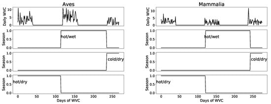 Table 3 shows two kinds of original datasets, i.e., stationary and non-stationary datasets. By observing the non-stationary datasets for Mammalia, Aves, Reptilia, Lepus saxatilis, and ecological seasons in Table 3, some weak seasonality and trends can be seen in the data. We used the ADF to test the data stationarity to justify the latter. Given a time-series data , the ADF uses the ordinary least squares estimator of to test the null hypothesis; mathematically, this is a regression problem with the form
