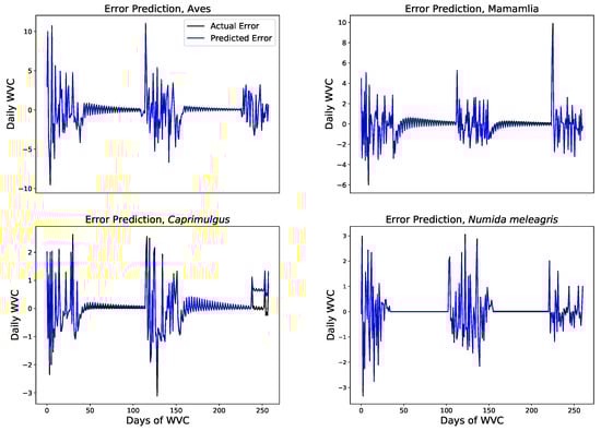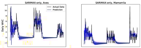 The results showed that the error correction framework outperformed SARIMAX-only when the linear components were more than the nonlinear components. In addition, LSTM-only outperformed SARIMAX-LSTM when the nonlinear components were more than the linear components, as shown in Table 8. We attribute this to the insufficient datasets collected and the inability of SARIMAX-LSTM to accurately detect seasonality on residuals from SARIMAX-only and minimize the SARIMAX-LSTM errors. We concluded that this method could be a promising technique if applied to a big dataset to improve prediction performance, especially for time-series data in ecology. This work opens the door to future investigations; we suggest collecting more data for each taxon, which would improve the model’s ability to predict. A hybrid linear SDM with LSTM is also a possible future study since some work has shown promising results with hybrid PCA-LSTM for time-series prediction. We further suggest using meta-heuristic algorithms, which have been successful in other domains [,].