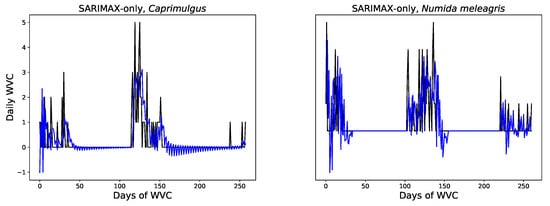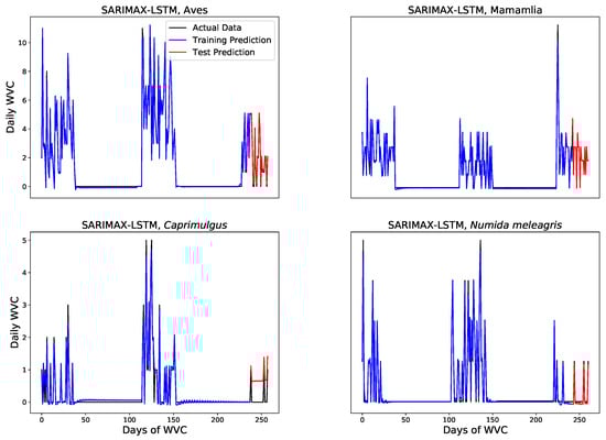 In this work, daily data on WVC on South African highways were collected from EWT. A stationary dataset was attained by transforming the original wildlife roadkill data. Next, the LSTM-only and SARIMAX-only models were used to model and predict wildlife roadkill patterns and the results were compared with our proposed error correction. For each model result in Table 8, we display the MAE, RMSE, and Pearson correlation coefficient metric in Table 2. We selected models for each taxon with very high positive (negative) correlations on the actual and predicted data as the best and focused majorly on the generalization performance of the models. The SARIMAX-only model generally performed poorly due to the high nonlinear temporal tendencies in the data compared to the linear components. The LSTM-only model obtained the best performance in three out of six experiments. The three time series were Lepus Saxatilis, Numida meleagris, and Reptilia. Although SARIMAX-LSTM was expected to outperform single models, it failed to overcome LSTM-only while predicting some taxa. The LSTM-only’s best performance can be attributed to (1) The ability of LSTMs to capture long-term dependencies using the availability of the recurrent memory gates. The LSTM gates considered previous training series in their prediction process, which created a better understanding of the past data and a more robust prediction process. (2) The availability of fewer categories of exogenous variables, which limited the capability of LSTMs to learn long-term dependencies from the SARIMAX residuals. (3) The absence of adequate extreme cases in the residual training set, which caused bias in the training process toward the prediction of more regular cases. (4) The lower total number of equal distribution of samples in the cold/dry, hot/dry, and hot/wet seasons. The best-selected taxa are visualized in Table 8 in red and bold text. These are also represented in Figure 9 for SARIMAX-only and Figure 10 for LSTM-only.