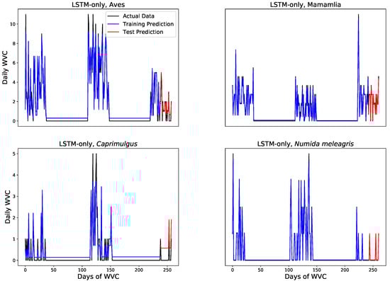 A time series of daily wildlife roadkill showing actual data and predicted data using LSTM-only on the Aves (top-left panel), Mammalia (top-right panel), Caprimulgus (bottom-left panel), and Numida meleagris (bottom-right panel) datasets.