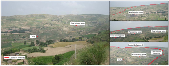 China is rich in coal resources. In recent years, the large-scale development and utilization of coal has brought huge economic and social benefits, providing a basic guarantee for economic development [1,2]. Engineering geological disasters caused by coal mining subsidence mainly include geological structure activation; surface cracks, collapse pits and karst collapse; landslides and collapse; rock bursts; mine earthquakes; coal and gas outbursts and other disasters. Mining subsidence is common in the mining area, but when landslide conditions are adequate in the mining subsidence area, mining subsidence in mountainous areas may induce a mining landslide; that is, it will cause the “resurrection” of ancient landslides and the occurrence of new landslides [3]. At the same time, the underground coal mining subsidence area weakens the underlying support of the mountain slope, thus inducing the mountain with landslide topographic and geological conditions to produce mining landslide [4,5]. For example, the Langshitan landslide caused by the Zijiang coal mine had a length of 2000 m, a width of 5–100 m and large-scale ground fracture zone damage with a visible depth of 5–12 m [3]. Generally, after the collapse of a coal mining subsidence area, there are often large cracks, pits and failure forms such as sliding or landslides accompanying the subsidence surface. These characteristics are the obvious signs of landslides in coal mining subsidence areas [6]. Coal mining subsidence area landslides not only directly damage the underground and surface construction facilities, resulting in casualties and huge property losses, but also lead to other secondary geological disasters and greater losses [7]. Tongchuan Mining Area, with the longest mining time in Shaanxi, has many ground fissures: there are 154 new and old landslides and 351 collapses and falling bodies [3] in the urban area that were caused by mining; the Madaling landslide in Fuxi village, Jiangzhou Town, Duyun City, Guizhou Province, has an overall sliding volume of 190 × 104 m3 due to coal seam mining [8]. In addition, unreasonable mining also worsens environmental problems [3]. This has brought direct harm to the surrounding ecological environment and the safety of people’s lives and property, and it has seriously affected sustainable economic development and social stability in the region [9]. Therefore, the study of landslides in coal mining subsidence areas has important guiding significance for disaster prevention and reduction [10].