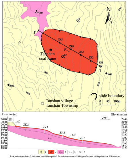 The Tanshan Coal Mine landslide in Ningxia, China is located in Group 2, Tanshan Village, Tanshan Township, Yuanzhou District, Guyuan City, about 1 km away from the Tanshan Township government. The coordinates are E 106°18′18.60″ and N 36°23′8.40″. The area where the Tanshan Coal Mine landslide is located is a typical continental semi-arid climate, characterized by less annual precipitation, concentrated rainy season, uneven precipitation distribution, strong evaporation, low annual average temperature, large temperature difference between day and night and more disastrous weather. In addition, the area is poor in water resources and poor in water quality. The groundwater type is mainly stagnant water in the upper layer, which is mostly between mudstone and loess, and the water level and water volume change obviously with seasons. The landslide area of the Tanshan Coal Mine is a loess hilly area with large topographic relief. Most of them are based on Jurassic or tertiary red mudstone. The Quaternary loess and loess-like soil fluctuate along and cover the ancient terrain with a thickness of less than 50 m. The terrain cutting is relatively strong, with an altitude of 1600–2000 m. It is dominated by loess beams and coexisting loess beams and loess hills, and the gully is in a “V” shape. The lower mudstone is often exposed at the bottom of the valley. The geotectonic structure in the area is located in the North Qilian fold area. At the end of Neogene, the tectonic line in the area extends in a north–northwest direction due to strong influence by the West Malaya movement and strong compression from the southwest. The mine was built in 1956. It is a small state-owned enterprise with a designed production capacity of 90,000 tons yearly and an actual production capacity of 107,000 tons yearly. The mining method is underground mining. The landslide is located in the west of Huangtuliang, Group 2, Tanshan Village. The front edge is a deep gully, which is nearly north–south, is high in the south and low in the north, and has strong cutting. The back wall of the landslide is close to the top of the beam. The terrain is relatively narrow, and the sliding mass is gentle. It is generally divided into two platforms, which are steep at the top and gentle at the bottom. The overall slope is about 10°, and the sliding direction is 290°. The original slope height was about 180 m, and the slope was about 11°. The landslide morphology of the Tanshan Coal Mine is shown in Figure 1. The geological map and profile of the landslide in the coal mining subsidence area of Tanshan, China, are shown in Figure 2.