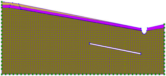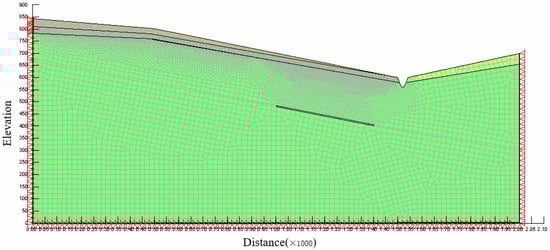 Firstly, we establish a goaf-free model. Then, according to the geological profile of a slightly inclined bedding mudstone landslide in the Tanshan Coal Mine after mining, a calculation model (as shown in Figure 4) is established for the critical state before sliding, that is, the state when the through weak zone is formed but there was no severe sliding, and it is divided into elements. The parts with complex stress changes that require key analysis are densified by 0.5 times and divided into a total of 11,420 nodes and 11,335 elements. For different models, there is no fixed grid density for reference, but the rationality of grid density can be determined by a grid convergence test. The boundary conditions in Figure 4 are that the left and right boundaries are X-direction displacement constraints, the lower boundary is X- and Y-direction displacement constraints, and the upper boundary is a free boundary. The model is taken as an approximate ideal elastic-plastic model, and the Mohr–Coulomb yield criterion is selected as the failure criterion.
