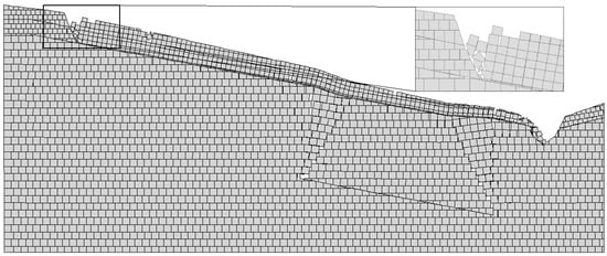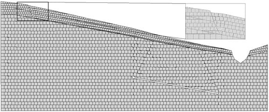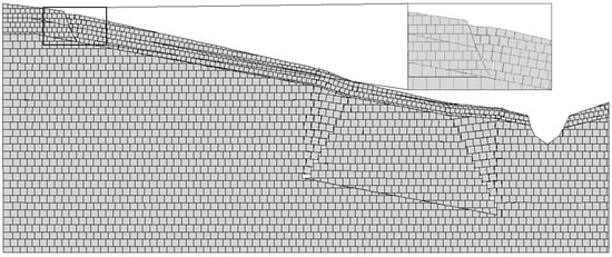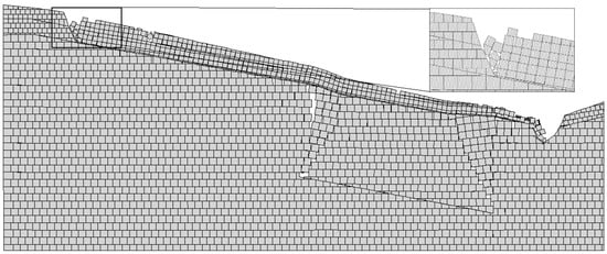When the numerical simulation iteration reaches 10,000 steps (Figure 6), the rock mass above the coal mining subsidence area deforms, and the deformation is transmitted to the surface. A small collapse can be seen on the surface, and mining cracks are formed on the contact surface of strong weathering and medium weathering, and the rock and soil mass is loose. Due to the influence of the frontal collapse basin, the slope begins to decline, and tensile cracks appear at the rear edge. The maximum displacement of the rear edge block was 0.5831 m according to the block tracking function of 2D-Block, and the displacement gradually increased from bottom to top in the vertical direction of the slope.