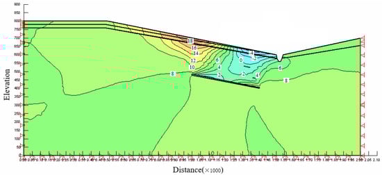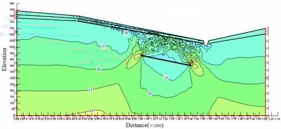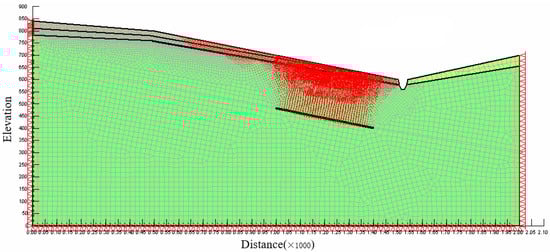 In Figure 10, the green part is the model grid, and the size and direction of the red arrow represents the displacement vector of the grid node. It can be seen from Figure 10 that the displacement of the slope mainly occurs in the middle and lower part of the slope and above the coal mining subsidence area. Due to the influence of mining, the stress field of the rock mass above the coal mining subsidence area is changed, and the stress of the rock mass in the mining area is released. The rock mass moves downward under self-weight stress and the extrusion of overlying strata, and the coal mining subsidence area is filled. Displacement is transmitted to the surface, and subsidence basins are formed on the surface. It can also be seen from the figure that the weak zone plays an important role in the formation of the landslide. The displacement vector has an obviously offset dislocation above and below the weak zone, and the displacement of rock soil above the weak zone is significantly greater than that below. This shows that under the influence of mining, the upper and lower parts of the rock and soil mass in the weak zone have downward displacement. Due to the effect of the weak zone, the displacement of the upper rock and soil mass is significantly greater than that of the lower rock and soil mass, and this difference in displacement makes the upper rock and soil mass slide in a relative manner.