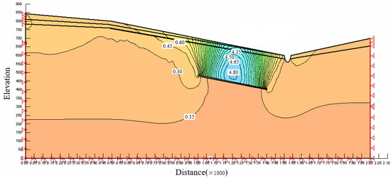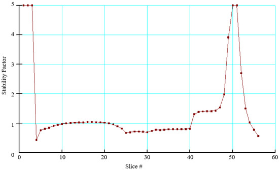 It can be seen that the stability coefficients of each strip obtained by the finite element method are different, and the difference between the maximum value and the minimum value can reach 4.6. Combining the available anti-sliding shear forces and sliding shear forces on the whole sliding surface and averaging them, a stability coefficient similar to that provided by the limit equilibrium method can be obtained. It can be seen from Figure 14 that the stability coefficient of the strip is closely related to the shape of the sliding surface. The trailing edge of the sliding body possesses a high safety factor due to the small division of the blocks, the small self-weight of the blocks, and the lesser sliding force relative to the shear strength; in the middle of the landslide, the stability coefficient decreases obviously at the junction of the landslide platform; at the landslide tongue at the front edge of the sliding mass, the angle of the sliding zone is very small and rock and soil mass accumulate here, so the safety factor increases obviously; finally, at the edge of the gully, the safety factor is very low due to the sharp increase in the angle of the sliding band and the influence of the free face.