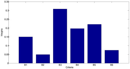 The analysis of the results from Figure 1 shows that criterion B3 has the greatest influence on the choice of the optimal alternative, i.e., its influence is 30.83%. Next in importance is criterion B5, which affects 22.11%, followed by criterion B4, which has a significance of 19.72%. Based on the obtained results, we can define the rank of the criteria according to the following ζ3 > ζ5 > ζ4 > ζ1 > ζ6 > ζ2.