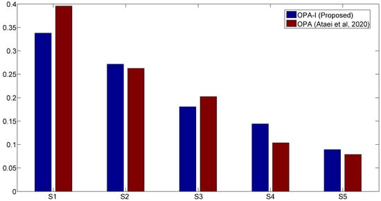 Based on the significance of the alternatives, we can define the following rank S1 > S2 > S3 > S4 > S5. A comparison of the proposed OPA-I methodology with the conventional OPA algorithm was performed to validate the obtained results. The results are shown in Figure 2.