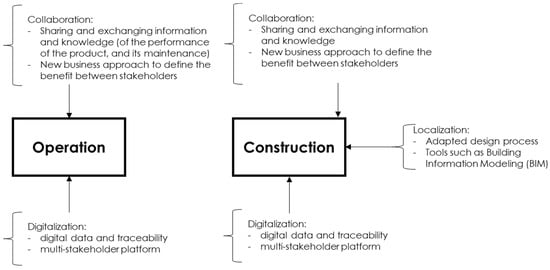 - Collaboration: There are many tasks that need strong connections between different stakeholders. Sharing and exchanging information and knowledge seem necessary in the different activities of production, supply chain, marketing, and design, to name a few. On the other side, the benefits for such collaboration between stakeholders should be considered, for instance accessing information and knowledge, interactive learning forms, and networking opportunities [21]. A value for a network of stakeholders should be created and sharing the information and market competition should be decoupled [16,23]. It is also important for stakeholders to present their commitment and responsibility to maintain the collaboration [21]. Stable relationships between different stakeholders in the long term is of vital importance. In this context, having new stakeholders with the role of keeping the connection between different actors is suggested [20]. Collaboration is essential to overcome several distinct barriers, for instance standardizations and codes in the knowledge barrier, resistance to change due to lack of trust in the cultural barrier, and promoting innovative business models to overcome the cost and infrastructure barriers, to name a few. In this context, a collaboration tool that has been already developed should be brought into practice [16].