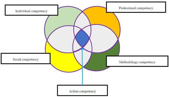 The model of professional teacher competencies has been introduced and used popularly in many courses of training and fostering for Vietnamese teachers [] (Nguyen T. Thuy, 2019). This model is based on several German studies and has been used in professional teacher development courses in Vietnam for the last two decades [] (Jakupec, Meier & Nguyen V. Cuong, 2006). This model constructs four capacity parts: (a) professional competency, (b) methodical competency, (c) social competency, and (d) individual competency [] (Nguyen V Cuong, 2006). The central competence is created from the synthesis of component competencies and action competence plays the most important role in professional competencies formed only when associated with specific actions (Figure 8).