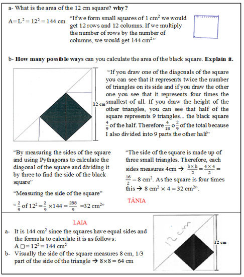 Task 8 proposed the following situation: “Tània and Laia are in the 2nd year of Secondary Education (ESO). In maths class, the teacher asks them to calculate the area of two squares using more than one procedure. Tània has difficulty for calculating the area of one of the squares. Laia has been able to solve the whole task using different procedures. What knowledge do you think Tània needs to be able to solve the task? How could the teacher help her? Justify your answer”. Figure 3 illustrates the students’ answers.