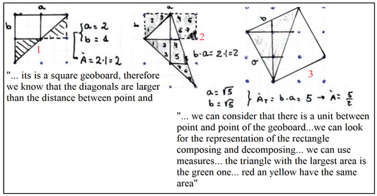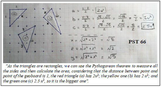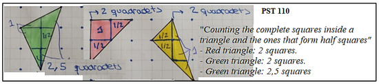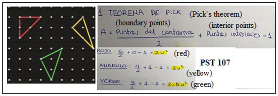 Connection QC8 is linked to conceptual-procedural knowledge. Thus, QC8 connection is auxiliary in KSM and procedural in KoT. It is observed that PST 7 identifies that the legs of triangle 3 correspond to hypotenuses of other right triangles (not given by the exercise). This allows her to use her knowledge of Pythagorean theorem to calculate the length of the legs (seen as hypotenuses of other triangles). Thus, the calculation of areas of right triangles allows to evoke content that serves as a support for the resolution of the task. In the case of connection QC12, the right triangles located on the geoboard allow PST 107 to evoke knowledge of Pick’s theorem (Figure 9), through a conceptual-procedural relationship, and which is linked to KoT-KSM. Something similar occurs with connection QC103, referring to the use of the semiperimeter formula for the calculation of areas.