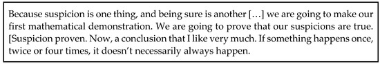 The evidence of the teacher’s mobilisation of KPM during the establishment of CRP connections allowed us to identify two patterns of knowledge. First, the knowledge mobilised by the teacher during the establishment of connections CC1, CC5, CC27 and CC33 emphasised general characteristics of mathematical practice (KPM). During connection CC1 the teacher emphasised the difference between demonstration and inductive intuition (Figure 10). During connection CC5 the teacher emphasises the importance of knowing how to explain where mathematical results come from (Figure 11). During connection CC27, the teacher points out the importance of knowing how to explain things, while in connection CC33 the teacher emphasises the importance of thoroughness in communication by stating “we should answer in the same terms that the problem asks us to. When the problem asks us to do divisions that are whole quotient then we speak that language. You haven’t told us anything about decimals”.