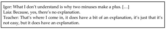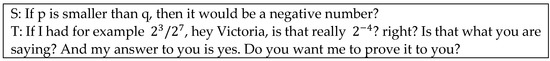 In the case of connection CC22 (Figure 18), there was a discussion on how to solve operations of type . During the discussion, the students proposed different procedures related to two properties of the integers, and . The teacher explains that all the proposed procedures are correct and makes some comments. Although it could be considered to be a connection that emphasises the properties of powers of integers, it was decided to classify it as a KSM, since it not only connects the concepts of multiplication and division of integers, but also makes explicit how they are connected, emphasising a property that may not be very transparent for the students, such as .