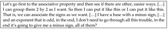 With regard to the second study, potential ambiguities are identified in 13 of the 34 connections identified. These ambiguities are related to difficulties in using MTSK to classify the knowledge mobilised by the teacher. In particular, in the 13 cases with ambiguities, difficulties are observed when using KSM subdomain, especially when possible inter-conceptual connections were observed. In three complex connections (CC9, CC17 and CC29), elementary connections were identified between operations with integers (powers and multiplication) and with the use of the associative property (Figure 14). At first, it was considered that the teacher was deepening connections of inter-conceptual type, and therefore knowledge belonging to KSM was mobilised. This type of connection can be interpreted as an auxiliary type of connection, since a mathematical property (associative property) is used with the calculation of negative base powers. However, it was observed that, although the teacher made detailed explanations related to the connection, the use made of the associative property was of a procedural type, and was therefore more related to properties and their underlying principles, than to the interlinking systems which bind the subject (Carrillo et al. [2]), so it was decided to classify the knowledge mobilised as KoT. For example, during the interactions defining the CC9 connection, while calculating , the teacher tries to organise the students’ proposals to introduce a property of negative base powers, which aims to justify a property whose use will be mostly procedural.