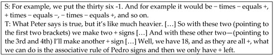 The same ambiguity between KoT and KSM occurs in connection CC17, where the teacher introduces an assessment of the use of a procedure proposed by a student for the calculation of compared to the use of the associative property to group the product of the 36 factors into 18 pairs of products that would give a positive result (Figure 15). As in the previous case, this could be interpreted as an auxiliary inter-conceptual connection indicating the mobilisation of KSM. However, the procedural role played by the connection relates more to knowledge of the properties that apply when operating with integers, and can therefore be classified as KoT.